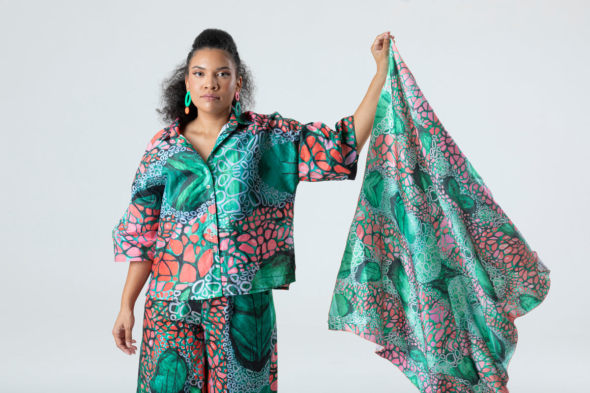Printed with one of our Veins prints on gorgeous silk charmeuse: Available in Croton, Bromeliad, Cycad Husk or Eucalyptus this piece is true indulgence!
