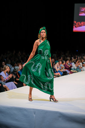Ampitji Rainbow Serpent off shoulder dress is handcrafted from gorgeous Aboriginal handprinted silk is inspired by antique aesthetic, off shoulder dress with loose cut looks stunning with belt or without.