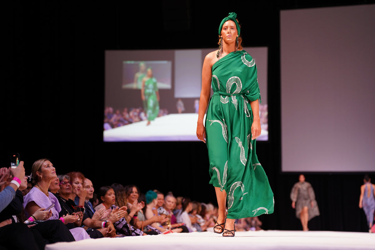 FLOW! by Tiwi Design x Ossom Ampitji Rainbow Serpent Off Shoulder Dress in Silk